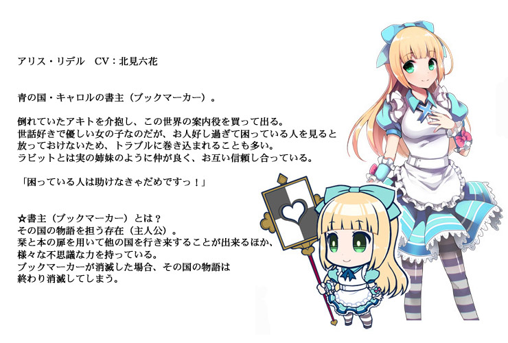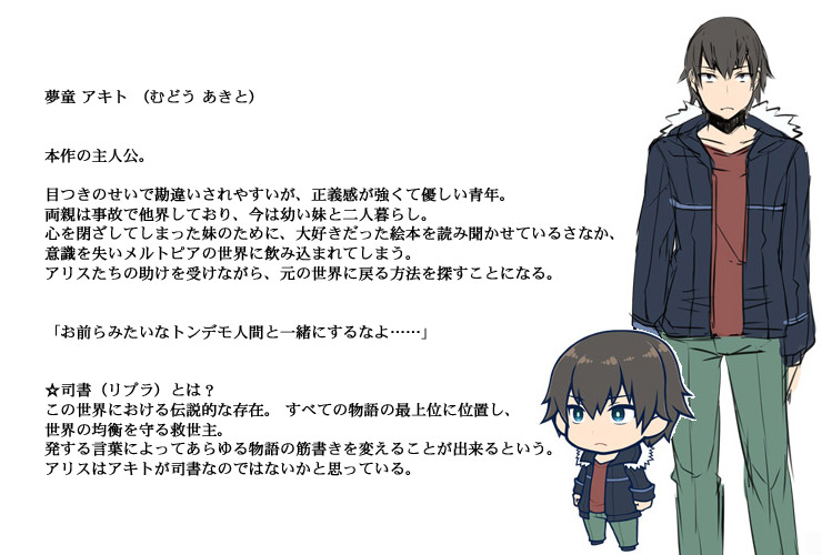 アキトは妹が大好きだった絵本を用いて彼女の笑顔を取り戻そうとする。 だがある日、アキトは闇にのまれて意識を失い、不思議な世界で目覚める。 そこは “メルトピア”―― 物語の中の存在たちが暮らす不思議な世界。 その住人であるアリスに助けられたアキトは、元の世界に戻る方法を探すうちに、この世界の危機に立ち向かうこととなる。 ■ CG