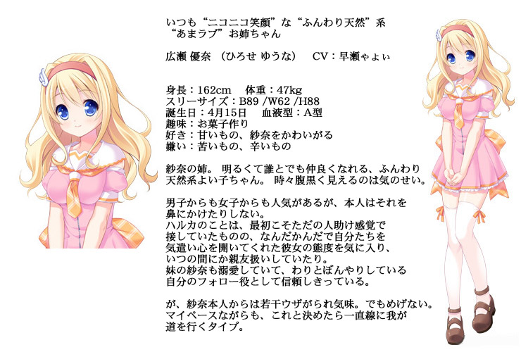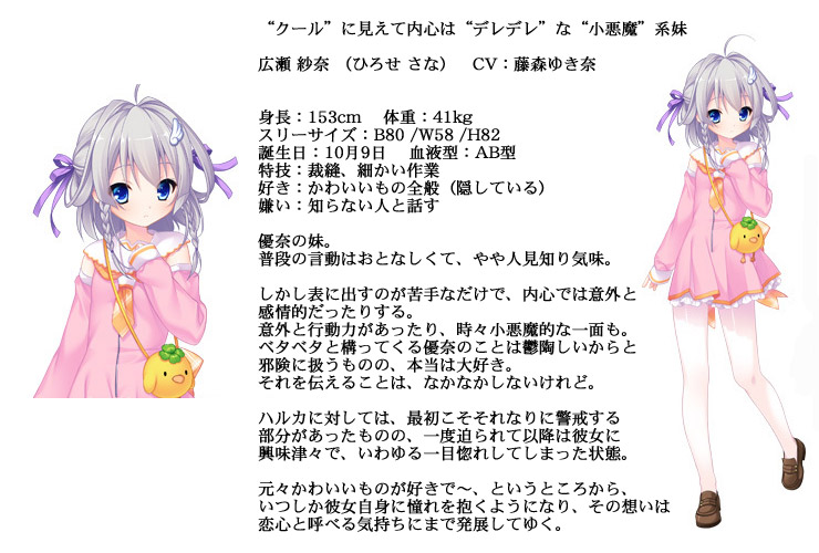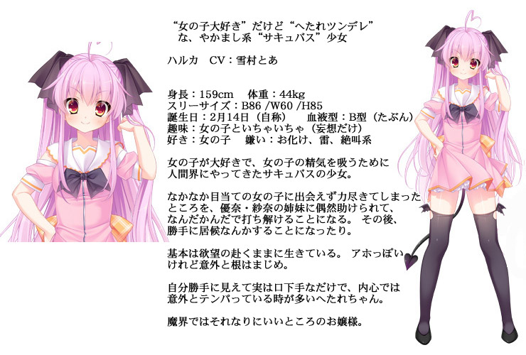 「うう……なんで男ばっかりに会うのぉ…… がくっ」 「あの、なんか色々と、大丈夫……?」 そこに偶然通りかかった、広瀬優奈と、妹の広瀬紗奈。 ふたりに助けられたハルカは一発で彼女たちを気に入って、その出会いを運命だと感じ、早速ふたりから精気を吸おうと画策するのだけれど…… なぜだか思った通りにいかなくて、ただの怪しい人みたいになる。 「悪魔なのに、へたれなんですね……」 結局、なんだかんだでふたりのところに居候しつつ、日常を過ごしてゆくハルカ。 魔界では経験できなかった友達との何気ないやり取りの中で、いつの間にか優奈・紗奈とずっと仲良く過ごしたいと思うようになっていて……。 そんなある日、紗奈から付き合ってほしいと告白されて、やっと自分の気持ちの正体に気付くハルカ。 自分も、ふたりのことを好きになっていたわけで…… だけど恋なんてしたことなくて、どうしていいのか分からない。 日常の中の、奇妙な三角関係。 だけど、3人で過ごす日々は、やっぱり楽しくて。 そんな彼女たちの気持ちは、これからどこへ向かうのか……? 「とりあえず……キスとか、してみる……?」 ■ CG