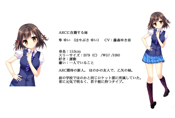 チュアブルソフトの新作は、4人しか部員のいない弱小ロケット部が存続を賭けて奮闘する、友情と努力の青春物語。 ロケット初心者の主人公と共にロケットの魅力を知ることができる作品でもあり、ロケット好きなスタッフのコダワリがふんだんに詰め込まれている。 10周年記念作品ということでシナリオボリュームは従来の約 1.5倍。 セリフも 2〜3倍と満載! よくしゃべってよく動く、見ていて楽しい青春活劇♪ エッチシーンもあまあま&フェチズム満点なものを各5回も用意しているそうなので期待! ■ キャラクター