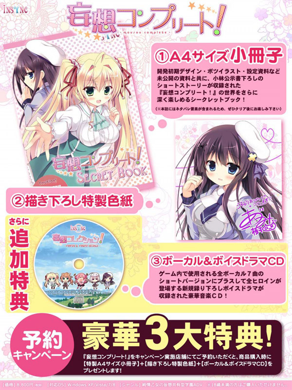 ![]() story ――――あれは、予知夢……? 主人公である小野寺誠司は、ときどき予知夢を観る。 それは断片的で、あやふやで。 だから本人はさほど気にすることなく日々を過ごしていた。 ある日も誠司は不思議な夢を観た。 見たこともない女の子と、まるで恋人のように親密なやり取りをする夢。 それだけでなく、身体を求め合う赤裸々な夢。 翌朝、誠司は目を覚ますと首を傾げた。 “果たしてあの夢は、予知夢なのだろうか?” と。 なぜなら、見たこともないような他人との出来事を予知したことなど、今まで一度も無かったからだ。 「ただの妄想だろう」 誠司は変に期待してしまいそうな自分の心を、そんな風に封じ込めた。 身支度をして、妹と共に学園へと向かい、教室に入り、クラスメイトと挨拶を交わす。 今日もそんな風にして、平凡な学園の日常が始まる……はずだった。 「――はじめまして。 春日エリカです」 耳慣れない澄んだ声が届き、ふと誠司は視線を上げ……絶句した。 その姿は紛れもなく、あの夢の中に出てきた女の子だったのだから。 呆然としている誠司とその女の子の視線が不意にぶつかる。 「あ――――――っっ!!!! う、うそっ…… 冗談……でしょ……!?」 そう先に叫んだのは、意外にも女の子のほう。 ……え? なんで ?? こうして誠司を中心とした不思議な恋の物語は、突然に始まるのであった――。 ■ CG