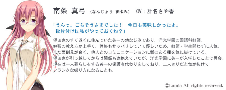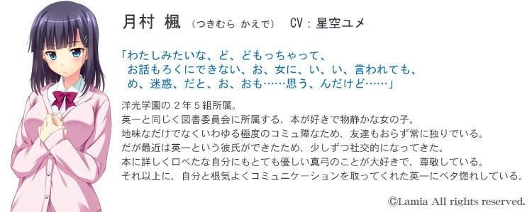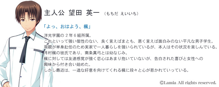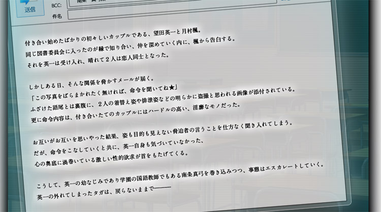 La mia 第3弾は、再びたまひよ氏が描くインモラルADV。 脅迫により強制的に卑猥な肉体関係を強いられた学生カップルの堕ち物語。 AfterEffects を使用したエッチシーンアニメーションもパワーアップし、オカズ度も強化! ![]() Story 付 き合い始めたばかりの初々しいカップルである、望田英一と月村楓。 同じ図書委員会に入ったのが縁で知り合い、仲を深めていくうちに楓から告白する。 それを英一が受け入れ、晴れてふたりは恋人同士となった。 しかしある日、そんな関係を脅かすメールが届く。 「この写真をばらまかれたく無ければ、命令を聞いてね★」 ふざけた語尾とは裏腹に、ふたりの着替え姿や排泄姿などの明らかに盗撮と思われる画像が添付されている。 さらに命令内容は、付き合いたてのカップルにはハードルの高い淫靡なモノだった。 お互いがお互いを思いやった結果、ふたりは姿も目的も見えない脅迫者の言うことを仕方なく聞き入れてしまう。 だが命令をこなしていくうちに、英一自身も気付いていなかった、心の奥底に渦巻く激しい性的欲求が鎌首をもたげてくる。 そして、英一の幼なじみであり学園の国語教師でもある 南条真弓 を巻き込みつつ、事態はエスカレートしていく…… 英一の外れてしまったタガは、戻らないままで―― ![]() ■ CG