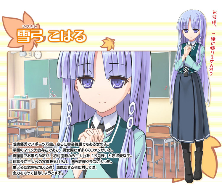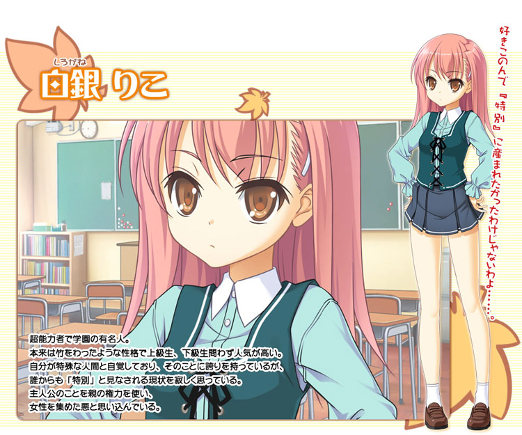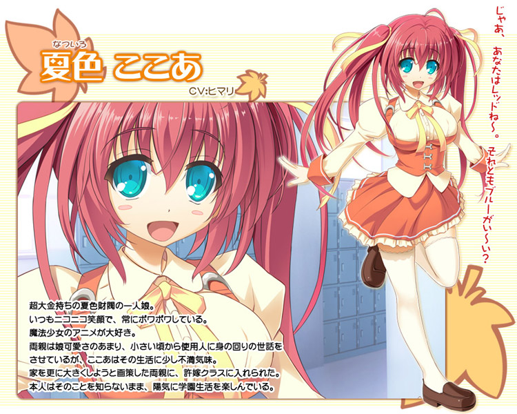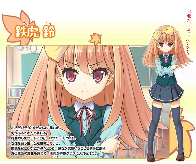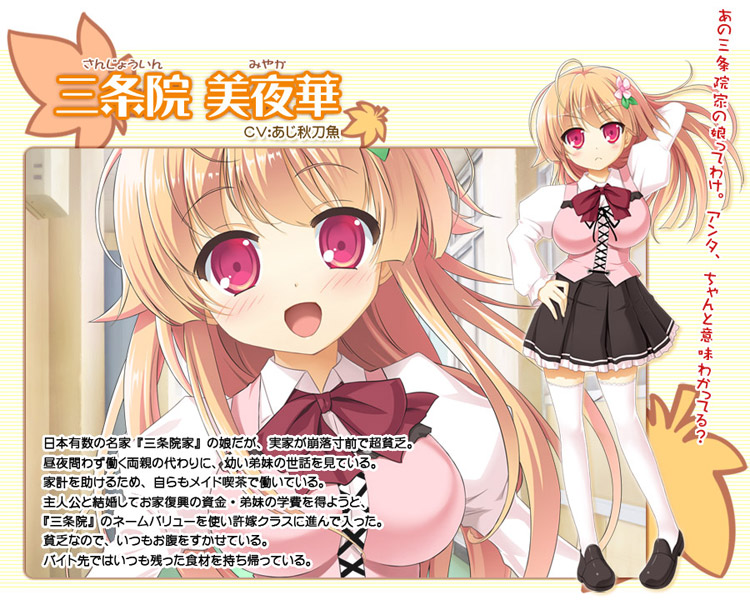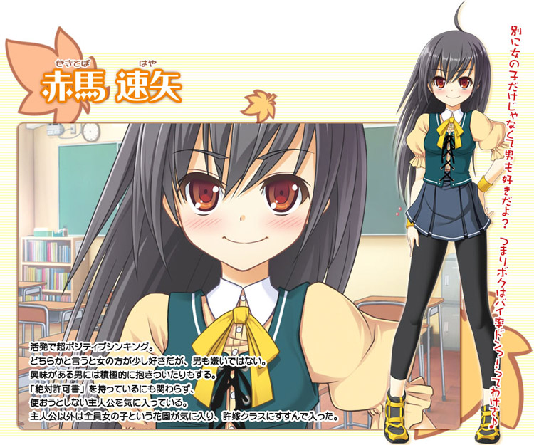 今 度のメイプルは嫁探し! ビビットなイラストや、多彩なミニゲームを組み込んだ斬新なシステムも人気を集めた 『メイプルカラーズ』シリーズ に、イメージを一新させる新作登場! 過去作は問題児だらけのクラスをまとめ、学園祭での優勝を目指す熱血コメディーなノリだったのに対し、 今作はクラスメイト全員が 嫁候補 として集められた女の子で、エッチしまくる日々を楽しむ学園ハーレムもの! 個性豊かな 14名もの女の子とイチャイチャしまくり、相性ピッタリの嫁を選ぼう♪ なお豪華限定版には、Win7/8対応の『MapleColors』 と、『MapleColors 2』 が付属 !! ![]() Story 紅 華学園の特別クラスに、無理矢理転入させられることになった主人公・織田信士。 その特別クラスとは、なんと信士のために集められた嫁候補たちだけのクラス。 もちろん男子は信士のみ。 学園の理事長であった信士の母親が、早く孫の顔が見たいと嫁探しのために転入させたのであった。 誰とでもエッチできる “絶対許可証” なるものを持たされて、戸惑いながらもヤリたい放題の日々を送る信士。 最初は信士に対して冷たい目線だった女の子たちも、一緒に学園祭の準備をするうちに打ち解けていく。 生意気で巨乳なツンツンお嬢様。 天然おっとり。 性に興味津々な女の子などなど…… 個性豊かなクラスメイト 14人の女の子たちを好きにできちゃう学園生活が始まるのであった! ![]() ![]() ![]() ■ テレカ画像 ![]() ■ CG
