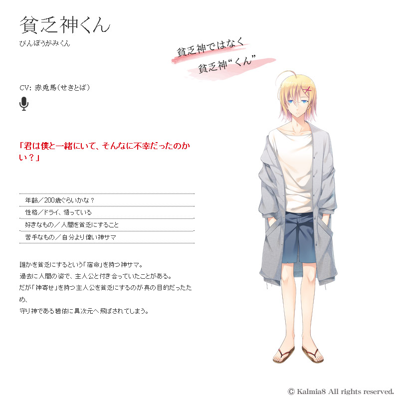 CV: 碧依:河村眞人 篠田洸太:五日天峰 貧乏神くん:赤兎馬 篠田月平:上夫甲辛 ダキ:本間かいな 佐倉鈴芽:夢野ぼたん 弁天ちゃん:上田朱音 大空真央:榛名れん 挿入曲: OP曲『野に咲いて輝いて』 vocal:五日 天峰 ED曲『二人の旅路』 vocal:河村 眞人 音楽制作:むにょっ(MUNYOT SOUNDS) ■ キャラクター
