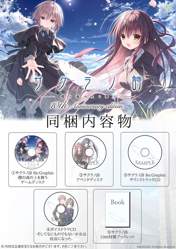 10年の時を経て「サクラノ詩」が新グラフィックで蘇る−−。 サクラノ詩 10th anniversary edition発売決定。 萌えゲーアワード2015大賞・ユーザー支持賞金賞、Getchu.com主催美少女ゲーム大賞2015で総合部門、シナリオ部門で1位を獲得した伝説の名作10周年記念特別仕様版として登場。 サクラノ詩は『サクラノ詩 Re:Graphic -櫻の森の上を舞う-』となり、グラフィックが刷新。 枕による最新の彩色で美麗CGが蘇ります。 さらにフルボイス(主人公を除く)、FHD画質(1920×1080)にも対応。 OPムービーも新しくなり、新規BGM、新規EDテーマ楽曲も追加。 UIもサクラノ刻仕様となります。 人気ヒロインである「御桜稟」「氷川里奈・川内野優美」の追加シナリオを収録したアペンドディスクを同梱。 続編であるサクラノ刻や未発表のサクラノシリーズ作品にも繋がるファン必見の内容です。 10th記念パッケージでは、豪華なディスク4枚組。 上記の2つのROMに加え、ボイスドラマCD、新規楽曲CDが収録されます。 10th限定特典として特典冊子を同梱。 グラフィックチーフ木根C×すかぢによる特別対談や、基4先生描き下ろしの特別漫画を収録。 サクラノシリーズファンはもちろん、これからサクラノシリーズを始めるユーザーにとっても間違いのない商品となります。 ■ 収録内容