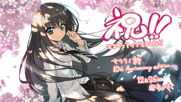 ■作品概要 10年の時を経て「サクラノ詩」が新グラフィックで蘇る−−。 サクラノ詩 10th anniversary edition発売決定。 萌えゲーアワード2015大賞・ユーザー支持賞金賞、Getchu.com主催美少女ゲーム大賞2015で総合部門、シナリオ部門で1位を獲得した伝説の名作10周年記念特別仕様版として登場。 サクラノ詩は『サクラノ詩 Re:Graphic -櫻の森の上を舞う-』となり、グラフィックが刷新。 枕による最新の彩色で美麗CGが蘇ります。 さらにフルボイス(主人公を除く)、FHD画質(1920×1080)にも対応。 OPムービーも新しくなり、新規BGM、新規EDテーマ楽曲も追加。 UIもサクラノ刻仕様となります。 人気ヒロインである「御桜稟」「氷川里奈・川内野優美」の追加シナリオを収録したアペンドディスクを同梱。 続編であるサクラノ刻や未発表のサクラノシリーズ作品にも繋がるファン必見の内容です。 10th記念パッケージでは、豪華なディスク4枚組。 上記の2つのROMに加え、ボイスドラマCD、新規楽曲CDが収録されます。 10th限定特典として特典冊子を同梱。 グラフィックチーフ木根C×すかぢによる特別対談や、基4先生描き下ろしの特別漫画を収録。 サクラノシリーズファンはもちろん、これからサクラノシリーズを始めるユーザーにとっても間違いのない商品となります。 ■ テレカ画像 ![]() ■ 収録内容