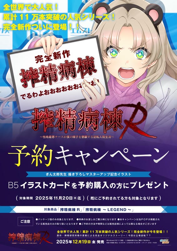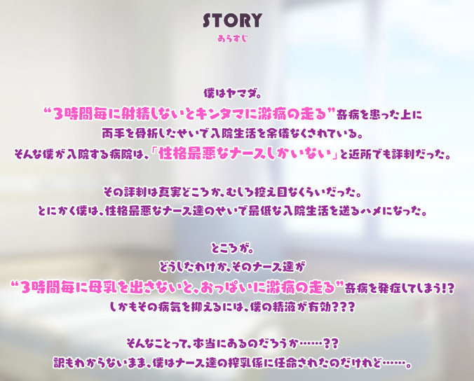 その入院生活を描いた『搾精病棟』の新作となる『搾精病棟R』では、ナースたちが“3時間毎に母乳を出さないと、おっぱいに激痛の走る”奇病にかかってしまう。