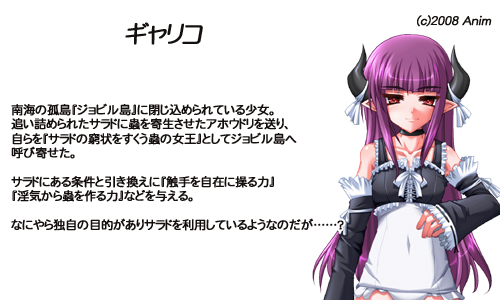 ギャリコと名乗った少女は、ある条件と引き換えにサラドに『触手』と『蟲』を操る力を与え、そしてアイラスを我が物とする手助けをすると言う。