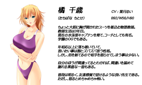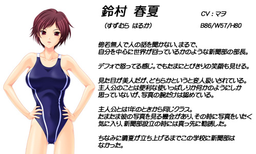 「水泳部に潜入するわよ!」 うちの水泳部にはオリンピックの代表選手に選ばれたキャプテンがいる。 かつて自らオリンピック選手候補だったコーチもいる。 ルーキーも最近めきめきと実力を付け、キャプテン以上になるんじゃないかと言われている。 確かに話題には事欠かないだろう。 しかし部長の狙いは、どうもそこじゃないらしい。 超美少女揃いの水泳部に最近悪い噂が流れてると言う。 どちらかというとその噂の真相を暴き、面白おかしく書きたてよう、という狙いがあるようだ。 取材期間中、部長は水泳部員として一時的に入部するらしい。 あまり気乗りはしないが……しゃーない。付き合ってやるとするか。 まずは噂の整理だ。 ●Hな薬を買ってるんじゃないかという噂が流れている。 ●学校の備品を使って自慰行為にふけってるなどという…。 ●スカートの下からモーター音!?ロープの跡がチラリと見える? 女子水泳部員や女教師顧問の痴態をこっそり嗅ぎ回り、事実を突き止めていくが事態は思わぬ方向に!? プールで部室で教室で!彼女たちと、うはうはラブラブ濃厚エッチの数々! 媚薬、玩具、コスプレ、ハーレム、何でもあり、のぞきに盗撮、さらには痴漢プレイまで! ネタ収集に失敗するとエッチなお仕置きまで…。 さて、噂の真相はどうなることやら。 ■ CG