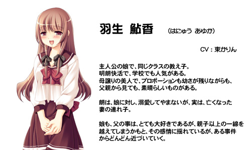 主人公・羽生 朗は、マンモス校に務める中堅の教師。 最愛の妻を亡くし、悲しみながらも、妻の連れ子でもある愛娘・鮎香との生活を送る。 物怖じする気弱な性格が災いし、学園内でも目立たない為、「俺って、ダメな奴だ…」と口癖になっている そういった落ち込んでいる朗に、愛娘の綾は、「ママの代わりになってあげる」と迫られ、慌てる主人公は、なすがままに愛娘の愛情(?)を受け入れてしまうことに! 愛娘との新生活が始まり、そんな状況に、主人公・朗は喜んで良いのか、さらに悩んで良いのやら…。 第二話(美奈編) 愛娘・鮎香(あゆか)が、怪我をしてしまい、入院中の為、自宅ではひとりぼっちの主人公・羽生 朗(はにゅうあきら)。 そんな中、妻の妹であり、職場の副担任である義妹・榊美奈(さかき みな)が、娘・鮎香との関係を知ってしまったのではないかと気が気でない朗の元に、美奈より呑みのお誘いがあるだが、その際に、 『私はそれでも構いませんけど、本当にいいんですか? ねぇ、先生。他人に聞かれていい話と悪い話があると思いません?』 と耳打ちされ、娘との関係を暗示されゾッとする。 二人っきりとなり、愛娘との愛欲の日々がばれ、突っ込む美奈が突然、朗へ性処理をしてあげると発言されて、朗は驚くのだった。 義妹・美奈との関係は如何となるのやら…!? 第三話(ハーレム編) 娘・鮎香の告白によって関係を持ってしまった主人公・羽生 朗だが、娘の情熱に感化されて、世間を敵に回しても、娘と添い遂げようと決意する。 しかし、その矢先、義妹でもある同僚の榊美奈に知られ、娘も入院で自宅から離れてしまう。 娘をかばうために、美奈の要求に従って関係を持ってしまうが、実は妻と結婚前から、美奈も朗が好きだったことが判明。 朗たちのことを考え、素知らぬふりをしてきた美奈のけなげさにもうたれ、関係を深めてしまう。 だが、娘の鮎香が退院してくる当日。 美奈も今度こそは後悔の無いように決着をつけたいと羽生宅に住み込んでくることを宣言。 帰宅した娘も、お姉ちゃんは好きだけど、パパがそうしたいならともかく、自分からパパを手放すつもりはないと受けて立つ。 こうして、主人公・朗を巡る猛烈なアプローチ合戦が始まる! ■ CG