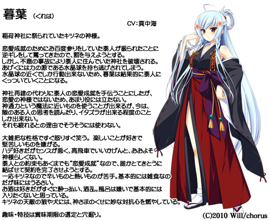 しかし、ろくに話したこともない彼女からの返事は、当然ながらNOだった。 悲しみに暮れる奏人は、今回の告白のためにお百度参りをしていた稲荷神社に着くと、「このお供え泥棒! 信心知らず! 神様なんて嘘吐きだ!」 と、理不尽な逆切れを社にぶつける。 しばらく罵倒し尽くした後、虚しくなって帰ろうとするが、なぜか身体が動かなくなり辺りが暗闇に包まれると、目の前には巨大な白い狐の化け物。 ありったけの謝罪の言葉を並べる。 「神を好き放題、罵倒した報いを受けるがいい!!」 どこからか現れた大量の蛇に追われ近くの大木によじ登ると、大木がミシミシと嫌な音を立てながら傾いく。 そしてその先には狐の化け物が棲む稲荷神社。 もの凄い音と共に大破する神社。 あまりの事態に泰人もビックリ。狐もビックリ。 街中を逃げ回ってから自分の部屋に逃げ帰ると、美しい蒼白の長髪をなびかせた黒い巫女さんが現れてさらにビックリ。 「貴様、わしの社を潰すとはいい度胸じゃな。これでも神の端くれ、死ぬ前に懺悔くらい聞いてやろう」 そう言って無理矢理ことのいきさつを説明させられてしまう泰人。 ……そんな事情がありまして。 ゴージャスな神社再建と引き換えに、おキツネ様と恋愛成就の契約を結んでしまった楠木奏人のドタバタ恋愛劇が始まる―― ■ CG