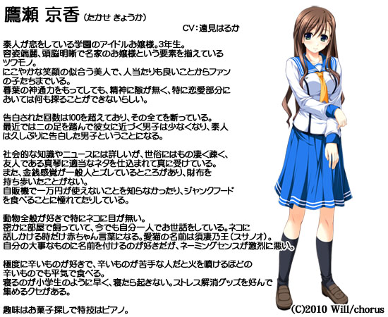 主人公の楠木泰人 (くすのき やすと) は、一目惚れをしていた学園のアイドル・鷹瀬京香 (たかせ きょうか) に告白した。