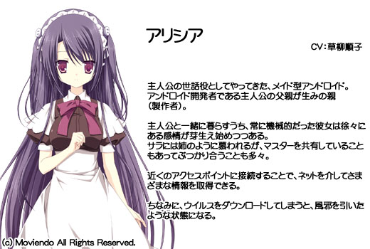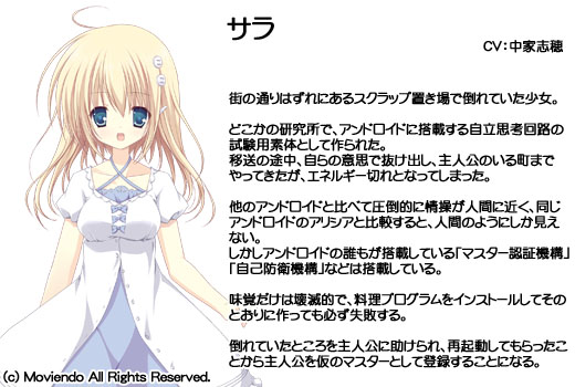 主人公・萩原博樹は、両親の仕事の都合で一人暮らしをすることになり、アンドロイドの開発会社に勤める両親から、生活支援と試作機のテストという名目も兼ねて最新式メイドロイド・アリシアが送られた。 彼女の仕事ぶりに感謝しながらも、プログラムに従って行動するアリシアとは一定の距離を置いて暮らしていた博樹。 そんなある日の学園の帰り道、ひとりのはぐれアンドロイドと出会う。 彼女は子供のようにあどけなく、ほとんどの知識を持たないまっさらな状態だったが、人間のように笑い、泣き、時にはお腹を空かせたりする、博樹の見たことの無いタイプのアンドロイドだった。 サラと名乗ったそのアンドロイドは、博樹をマスターとすることを望み、その時からサラは博樹をひとりの男性として認識するようになる。 アリシアもその影響を受けて今までにない感情を表すようになり…… 二体のアンドロイドは、それぞれに博樹を必要とし、求め始めていく。 ■ CG