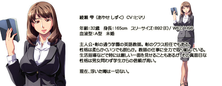 主人公・吉岡彰は親の仕事の都合で、一人暮らしをしながら都内の某学園に通う学生である。 彰はどこにでもいるようなごく普通の少年だったが、なぜか同年代の女性にはあまり興味が持てず、性的な興味の対象が年上女性のみに向けられていた。 そんな彰には、学園の中に気になる年上女性が3人いた。 ひとりは、自分の担任である英語教師の綾瀬雫 (あやせ しずく)、 そして、養護教諭の栗山美潮 (くりやま みしお) 、3人目が学食で働いている松坂千波美 (まつざか ちなみ) である。 しかし、それはあくまでも “憧れの対象” であり、自分が実際に彼女たちとどうにかなることなどはあり得ないと考えていた。 だが、様々な経緯から、彰は3人の女性たちそれぞれと近づく機会を得て、紆余曲折を経たのち、最終的には肉体関係を持ってしまう。 そして彰は、成熟した女性が見せる “もうひとつの顔” をかいま見るとともに、性愛の深淵を体験することで、大人への階段を上っていった……。