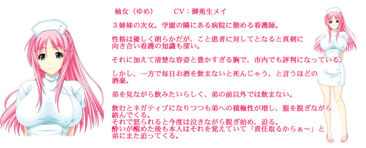 次女柚女(ゆめ)看護婦。清楚で優しい白衣の天使で病院内の患者や医師からも