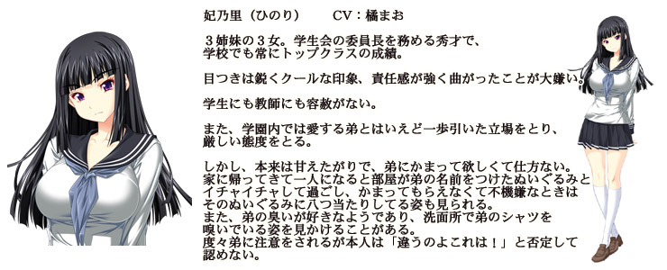 三女の妃乃里(ひのり)は学生会の委員長。理知的な才女で成績は校内トップで