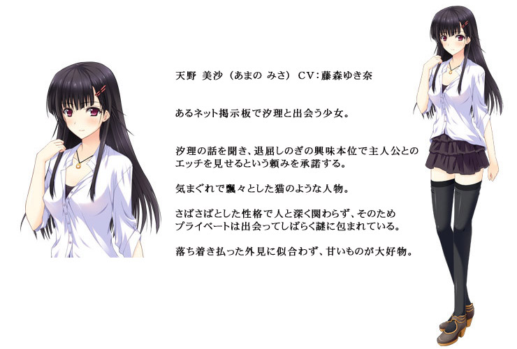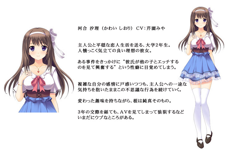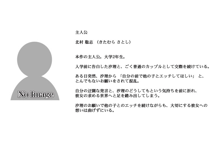 交際 3年目となる大学生活を、順風満帆に謳歌していた。 そんなある日、聡志の隠し持っていたエッチな動画を見てしまったことで、汐理に異変が起きる。 「わ、私の前で、ほかの女の子とエッチしてほしいのっ……」 恥じらう彼女の口から飛び出した、とんでもないお願い。 どうしてそんな話に!? 予想外の不意打ちにうろたえる聡志だったが、彼女の頼みを無下にするのもはばかられ、「相手の子がいないことには……」と、その場をやんわり誤魔化したのだった。 それから数日後。 いつも通りの日常を過ごす聡志のもとに、汐理が見知らぬ女の子を連れてやって来る。 天野美沙 (あまの みさ) と名乗る彼女は、なんと汐理が聡志とエッチしてもらうために見つけてきた相手だった。 戸惑う聡志をよそに、美沙はあっけらかんと話を進めて浴室へと消える。 自分の迂闊な発言と、やっぱり無理なお願いだったと困惑する汐理を前に、いよいよ逃げ場を失った聡志。 ふたりの話はついたものと見て迫ってくる美沙にリードされ、聡志はされるがまま行為を進めていく。 汐理を想いながらも快楽には耐えきれず、本番へと導かれる聡志。 ――本当に、自分の彼氏が目の前で他の子とエッチしている。 涙をにじませながら、それでも目を離すことができない汐理は、固唾を飲んで行為を見つめ続けた……。 ■ CG