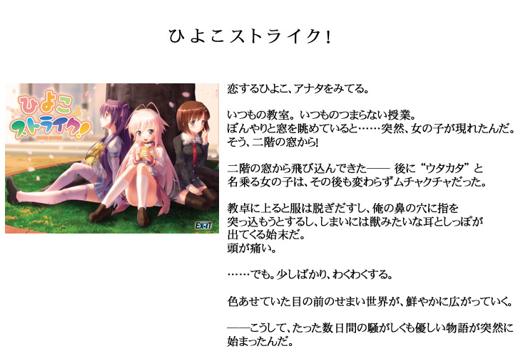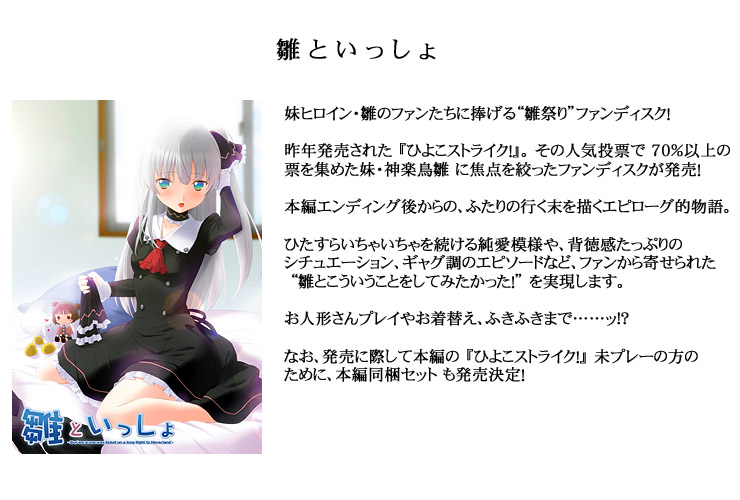 2012年、に発売された 『ひよこストライク!』。その人気投票で 70%以上の票を集めた妹キャラ・神楽鳥雛 に焦点を絞ったファンディスクがついに発売! 「雛とひよこのラブラブ同梱セット」は、本編とファンディスクをセットにしたお得なアイテム! ■ キャラクター