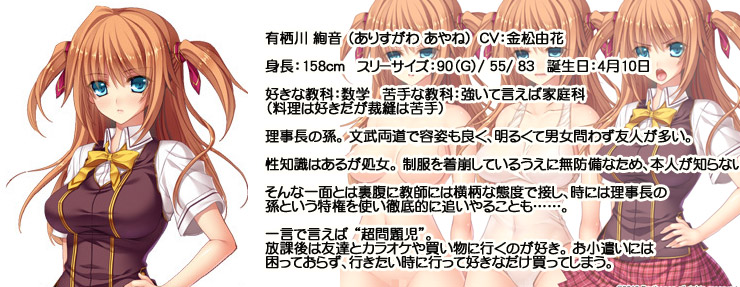 理事長の孫でありスタイルや顔立ちもよく成績も常にトップをキープ、誰とでも明るく接する非の打ち所が無い有栖川絢音。