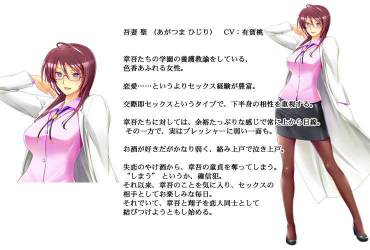 学園の養護教諭・吾妻聖 (あがつま ひじり)。 きっかけは、展望台にいた聖に章吾が声を掛けたこと。