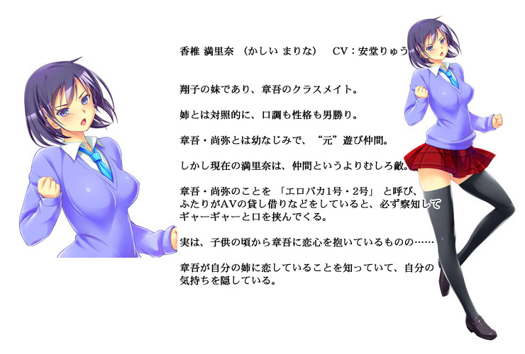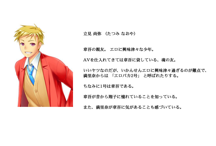 翔子は、章吾の幼なじみである満里奈 (まりな) の姉であり、数年前に満里奈を通じて会った時に、一目惚れしてしまった。
