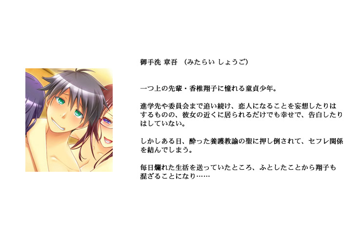 御手洗章吾 (みたらい しょうご) は、年相応にエッチなことに興味のある男子学生。 だけど童貞。