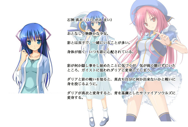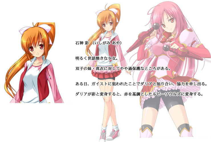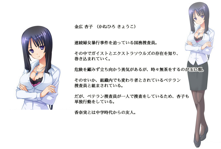 犯人は被害者と共に見つかっているものの、その凶行はまるで伝染しているかのように次々と犠牲者が現れていた。 そんな中、石神彩は帰り道で不審な男に襲われる。 誰かに助けを求めようにも、気づけば辺りには誰もいない。 だが、彩の耳に何者かの声が聞こえ、その声に導かれるように逃げ出す。 それでも追い詰められた彩は、突如意識を失ってしまう。 代わりにその場に現れたのは、赤い衣装を身にまとった少女だった――。 それ以来、彩は少女の霊 “ダリア” の姿が見えるようになる。 彩を人の魂を食らう幽体の異形 “ガイスト” から守ったのは、彼女の力によるものだった。 ダリアは、彩の魂と触れることで変身し、エクストラソウルズとしてガイストと戦えるようになると話す。 頼む、私に協力して魂を貸してくれ! 魂を共有することで、ガイストに犯されるダリアと感覚を共有し、心を穢されていく彩。 双子の妹・真衣も戦いに巻き込まれ、彩たちはガイストとの戦いと凌辱の渦に飲み込まれていく。 ■ CG