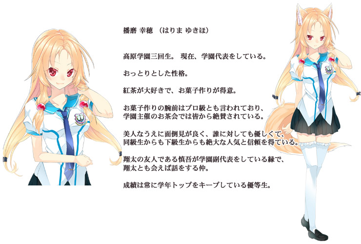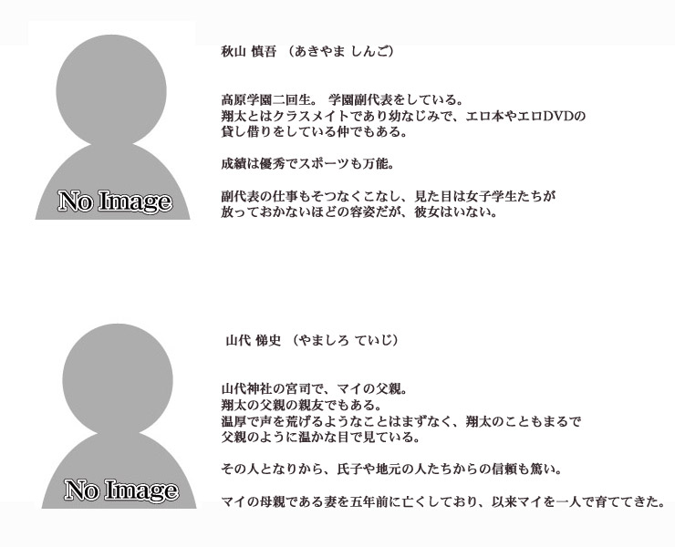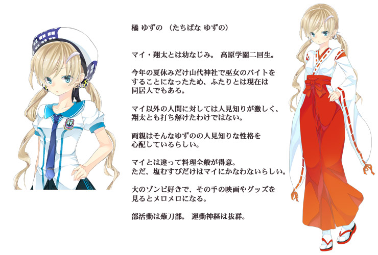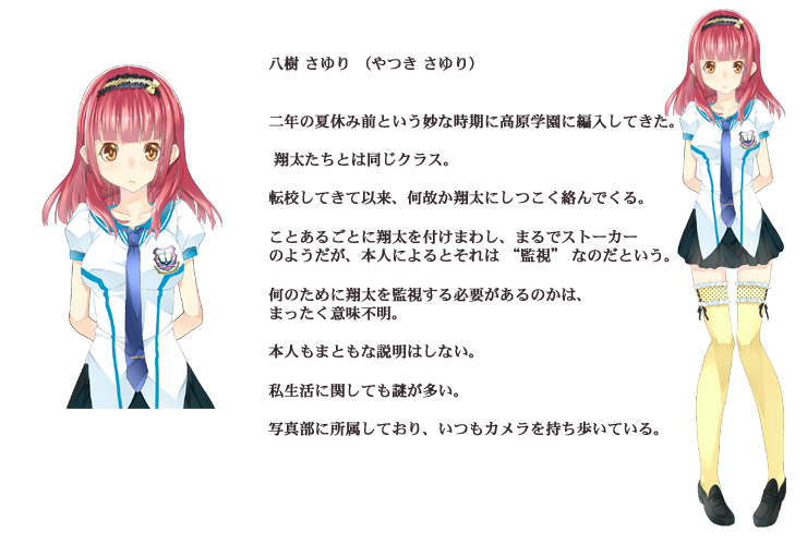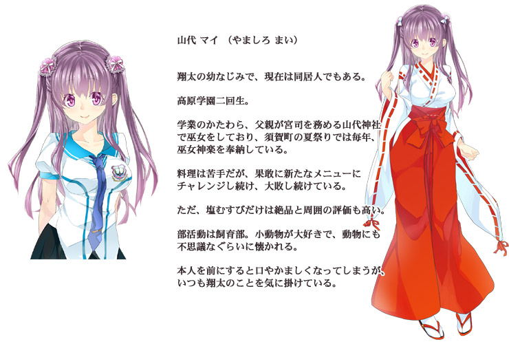 それは美しい港町……俺の故郷……須賀町……。 北側は海、南側は山。 温暖で平和な小さな町。 時間が穏やかに流れる、俺の町。 そこで俺は、幼なじみの山代マイと仲良く暮らしていた。 俺とはちょっと距離があるが、マイの親友である 橘ゆずの。 同じクラスで、なぜか俺に付きまとってくるちょっと風変わりな女の子・八樹さゆり (やつき さゆり)。 上級生で学生代表、学園中の憧れである 播磨幸穂 (はりま ゆきほ) 先輩。 悪友の秋山慎吾や、やさしい大人たちにも見守られ、みんなとわいわい楽しい日々を過ごしていた。 しかしある夏休み。 俺たちはとんでもない事件に巻き込まれてしまう。 俺の中に居るアイツが目覚めようとしていたのだ……。 俺の名前は 八賀谷翔太 (やつがや しょうた)。 俺は、ヤマタノオロチの生まれ変わりだった……。 ■ CG
