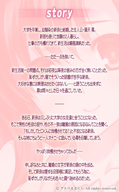 ア トリエさくら新レーベル第四弾! <今回のセールスポイント> ・原画家かん奈氏が描き出す初々しい新妻・新奈さんと甘々なイチャらぶ新婚生活! ・恥ずかしがり屋でエッチに積極的ではなかった妻がどんどんと淫らに。 敏感な身体でエッチにのめり込んでいく! ・一緒にお風呂・裸エプロン等新婚さんの定番プレイがいっぱい! 更に変わった知識をつけた新奈さんは過激なプレイにも挑戦し…… ■ キャラクター