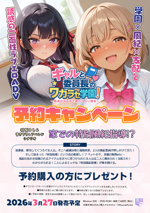 商品を購入された方へ【ダウンロードコンテンツ・アペンドシナリオ】をプレゼント! ※カード記載にアドレスにアクセス。コードをいれていただくことでコンテンツをお楽しみいただけます。 タイトル:家での特別風紀指導!? あらすじ: 放課後、帰宅してくつろぐ主人公。 そこへ綾瀬沙耶と風間莉菜、2人の風紀委員が押しかけてきた! そして始まった「特別指導」という名の粗探し!? ベットの下、本棚の隙間etc…風紀の乱れを指摘されるアイテムを次々に見つけられた主人公は、二人に責められ!支配され!わからせられる!二人によるエッチな「特別風紀指導」が幕を開ける! 出演ヒロイン: 綾瀬沙耶:黒髪ロングの真面目なドS風紀委員長。今回は主人公の家に訪問、スケべなものを摘発!風紀指導に奮戦! 風間莉菜:典型的ギャルだが風紀委員。委員長と一緒に主人公の部屋に行こう!と誘った張本人♪