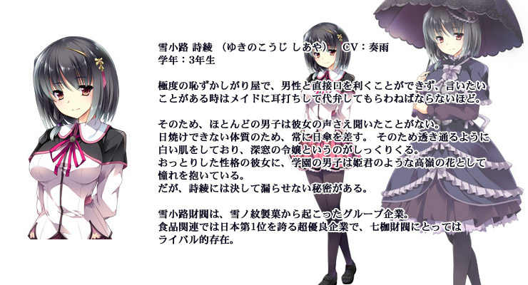 極めつけは、七枷財閥のライバル企業である雪小路財閥のお嬢様・雪小路詩綾 (ゆきのこうじ しあや)。 おとなしげな深窓の令嬢が、俺の手を握りいきなり、愛の告白を?