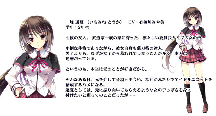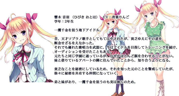 お嬢様以外にも、同じ天照院(てんしょういん)学園に通う、響木音羽 (ひびき おとは) から突然、アイドルを目指していると相談されるわ。