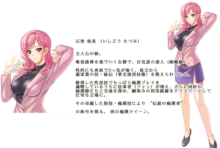 組織の痴漢師たちに堕とさせた女性たちを利用し、組織の支配路線で “痴漢電車” を運営するほか、痴漢絡みのあらゆる方法で莫大な利益をあげる。