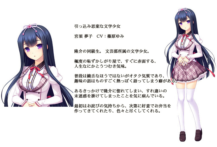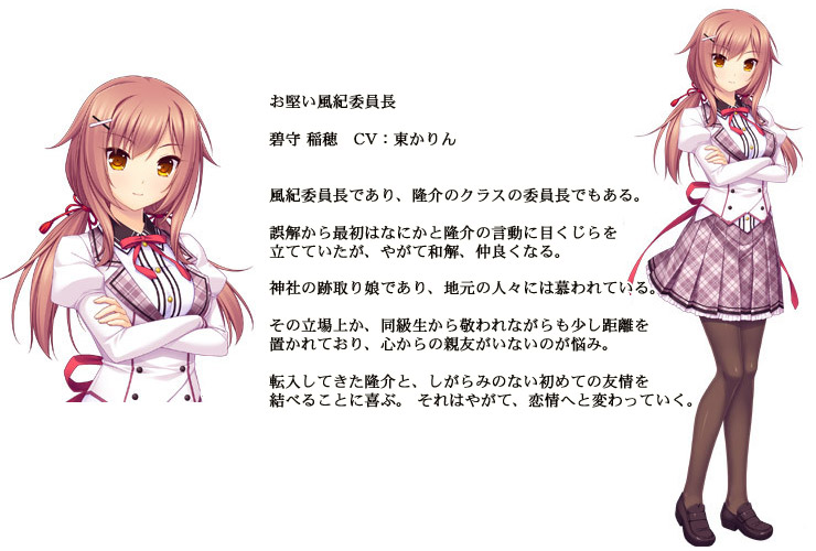 神社の娘でまじめな性格の風紀委員・碧守稲穂、物静かだが内に熱い思いを秘めた文学少女・宮須夢子、