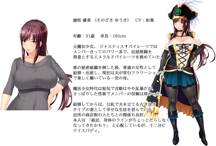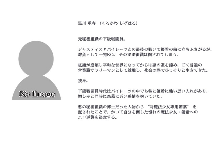 悪の秘密組織と戦い、平和を勝ち取った魔法少女 ジャスティス†パイレーツ。 最後の戦いから15年。 普通の少女に戻った彼女たちは、自分たちが守った平和な世界で大人になり、恋をし、幸せな結婚をしてそれぞれが穏やかな家庭生活を育んでいた。 だがある日、ジャスティス†パイレーツの一員・エメラルドパイレーツであった園咲優希は、悪の秘密組織の下級戦闘員であった黒川重春に見つかってしまう。 重春は魔法少女であった時から優希のことを犯してやりたいと考えており、人妻となった彼女との再会で昔の思いが蘇り、彼女へ寄せる淫らで邪な思いを募らせていく。 そんな中、重春にはもう一つの出会いがあった。 それは、悪の秘密組織の博士だった人物。 今は屋台のオヤジに身を落としている彼は、なんと15年間保管していた “対魔法少女用極秘アイテム” を持っていた。 アイテムの一つ、“魔法少女を必ず快楽漬けにできる媚薬” を託された重春は、元魔法少女である人妻・園咲優希に対してエロ逆襲── 痴漢寝取り を決意する。 “対魔法少女専用媚薬” をはじめとする数々の怪人アイテムを駆使し、痴漢で揺さぶり寝取りでトロかして、元魔法少女を身も心も自分のモノにしろ! ■ CG