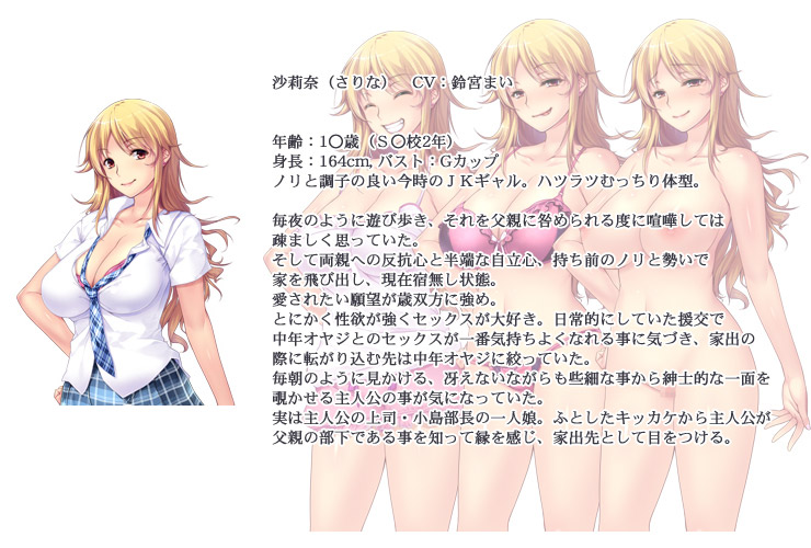 本作は、とある事情から家出してきたJKギャル「沙莉奈」を泊めるところから物語がはじまります。 もちろん、泊めてもらうワケですから彼女はそれなりの対価――つまり、若い身体をオジサンであるアナタに差し出します。 煩わしいシステムはありません。美麗CG、卑語無修正でお送りする本作で思う存分、ギャルと同棲してハメまくりましょう! ■ キャラクター